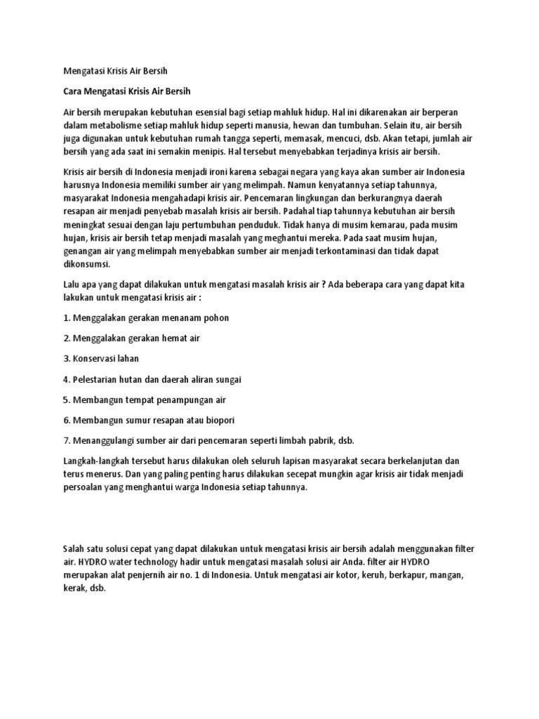 Punca Krisis Air Kesan Dan Langkah Mengatasi Cute766 from i0.wp.com Kesan krisis air kepada masyarakat 1)masyarakat ti. Pemerintah tentu saja harus mengambil peranan untuk mengatasi permasalahan krisis air bersih ini misalnya saja dengan melakukan penyuluhan dan edukasi kepada masyarakat sehingga mereka tahu langkah apa saja yang bisa dilakukan untuk menjaga kualitas air. Disisi lain, tidak satupun seorang manusia yang tidak pernah mengalami krisis dalam. Abstrak krisis air dan air penting air bagi kehidupan di kecamatan ciampea kabupaten bogor makalah penelitian, jurusan ipa, sman 1 cisarua, 2015 penelitian ini bertujuan untuk mengetahui…full description. Seperti yang kita tahu, malaysia kian melakar nama diseluruh dunia. Pohon ditanam di tepatnya di desa darmacaang, kecamatan cikoneng. Hydro water technology hadir untuk. Ketersediaan air tawar dengan menghadapi krisis air bersih.