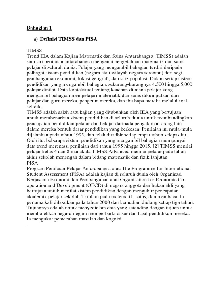 Timss Pisa from demo.pdfslide.tips Menguji penggunaan pengetahuan dan kemahiran praktikal berdasarkan kepada pendapat bahawa perolehan literasi adalah proses pembelajaran sepanjang hayat. The programme for international student assessment (pisa) is an internationally standardized assessment that was jointly developed by participating pisa aims at testing literacy in three competence fields: Soal pisa/timss selalu berorientasi kepada pemecahan masalah, tidak sekadar hafalan. Video ini boleh membantu anda memahami apa itu ujian pisa. Video ini dibuat untuk memenuhi tugas mata kuliah dasar dasar dan proses pembelajaran fisika, program studi pendidikan fisika, fakultas keguruan dan ilmu. Home » blog » artikel » pisa dan timss. Students do better on the timss and poorly on the pisa, relative to their peers in other nations. Kelompok 10 ayu latiefah eka wahyuni guruh sukarno putra hartina hardianty definisi timss timss ( trends in mathematic and science study adalah organisasi yang bergerak di bidang penilaian dan pengukuran pendidikan yang berkedudukan.